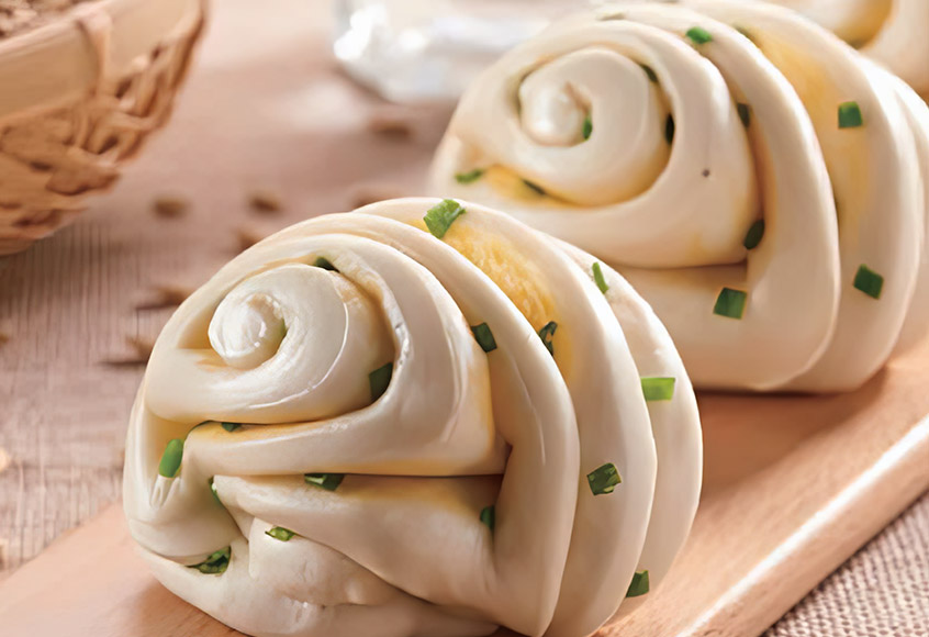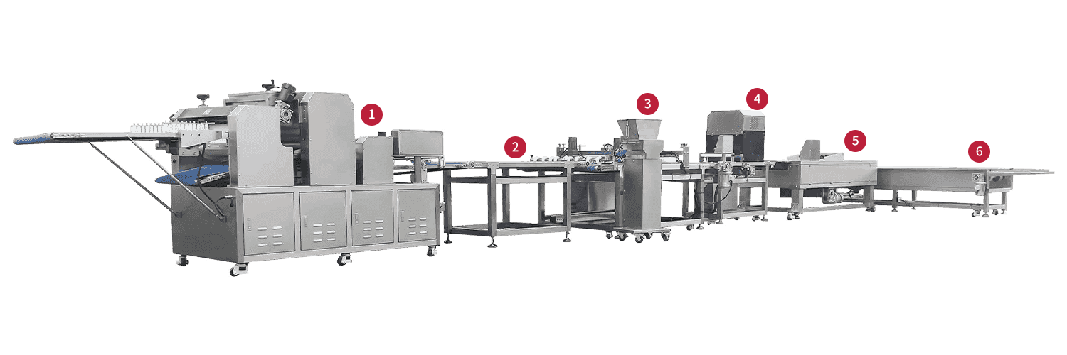 Jalur produksi terdiri dari mesin pembentuk roti ST-868-600 pastry, mesin shunting empat saluran, mesin gulung tepung empat saluran, mesin konsentrasi empat saluran, CT-QT450 Double Servo Steamed Bread Cutting Table, dan CT-WP500 Horizontal Plat Machine (Model 500).